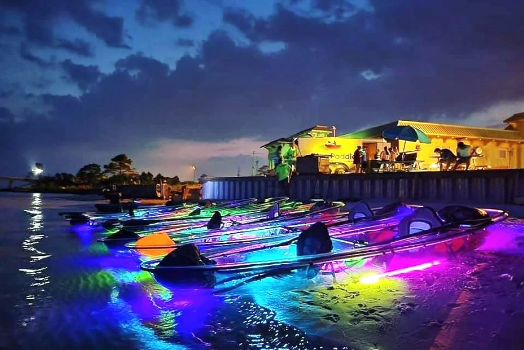 Glide over the beautiful Pensacola Beach Sabine at Margaritaville or the beautiful Bay at Lagunas Adventure Park Bar & Grill or under the Navarre Beach Bridge in our Crystal Clear LED Lighted Kayaks, an experience found nowhere else in the Panhandle!